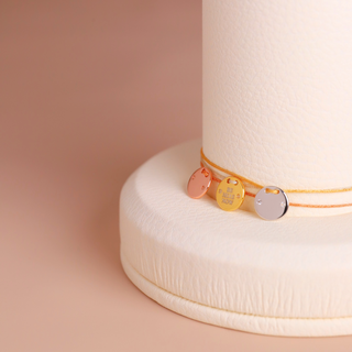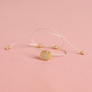 ブレスレットの端にあるコードは、ポジショニングビーズを動かすことで隠すことができます。手首にしっかりフィットするので、着け心地がよく、フレキシブルです。また、他のブレスレットとの重ね付けも簡単です。